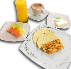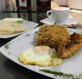 Calentado de frijoles con arroz, arepa, quesito, huevo, carne de res o cerdo, café o chocolate.