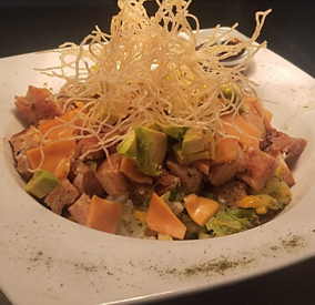 Delicioso pollo pechuga al wok, con vegetales, tocineta crocantes. Acompañado con aguacate y servido con el mejor queso y salsa de la casa.