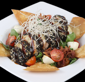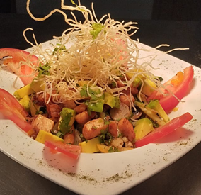 Frescas misturas de lechuga. Acompañado con tostones de pan, tomates salteados, tocineta y huevos de codorniz. Servido con pollo encostrado en ajonjolí y salsas del Chef.